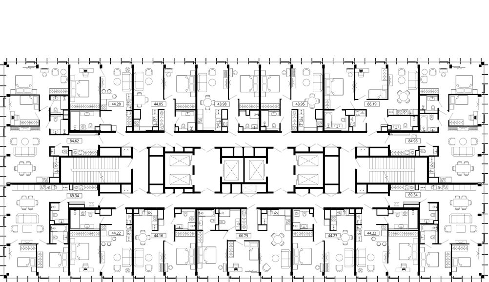 Продается 1-к квартира общей площадью 43.39 м² без отделки в ЖК премиум-класса Mod на 51-м этаже 55 этажного дома.