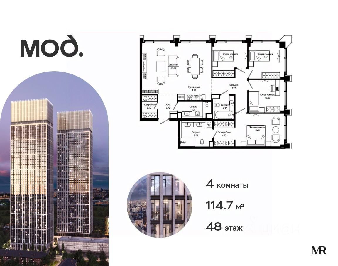 Продается 4-комнатная квартира общей площадью 114.70 м² с предчистовой отделкой в ЖК премиум-класса Мод на 48-м этаже 55 этажного дома.