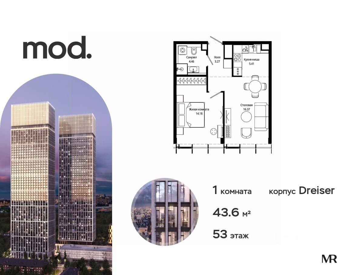 Продается 1-комнатная квартира общей площадью 43.69 м² без отделки в ЖК премиум-класса Mod на 53-м этаже 55 этажного дома.