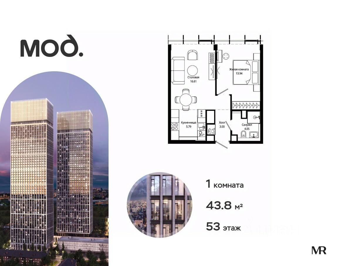 Продается 1-комнатная квартира общей площадью 43.80 м² без отделки в ЖК премиум-класса Мод на 53-м этаже 55 этажного дома.