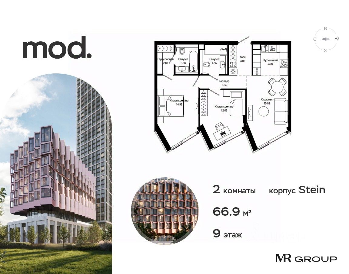 Продается 2-к квартира общей площадью 66.90 м² с чистовой отделкой в ЖК Mod на 9-м этаже 9 этажного клубного дома.