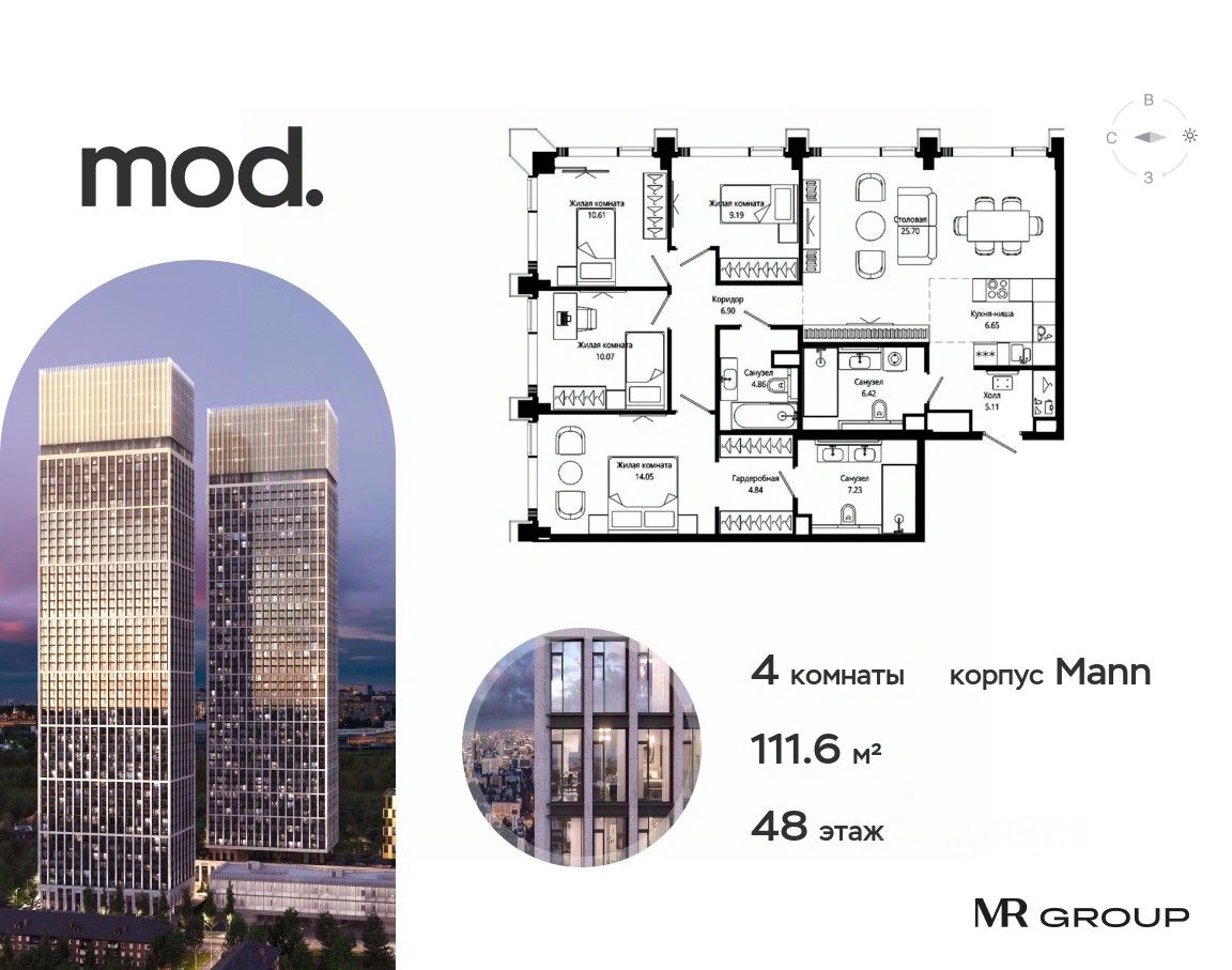 Продается 4-к квартира общей площадью 111.63 м² с предчистовой отделкой в ЖК премиум-класса Mod на 48-м этаже 55 этажного дома.