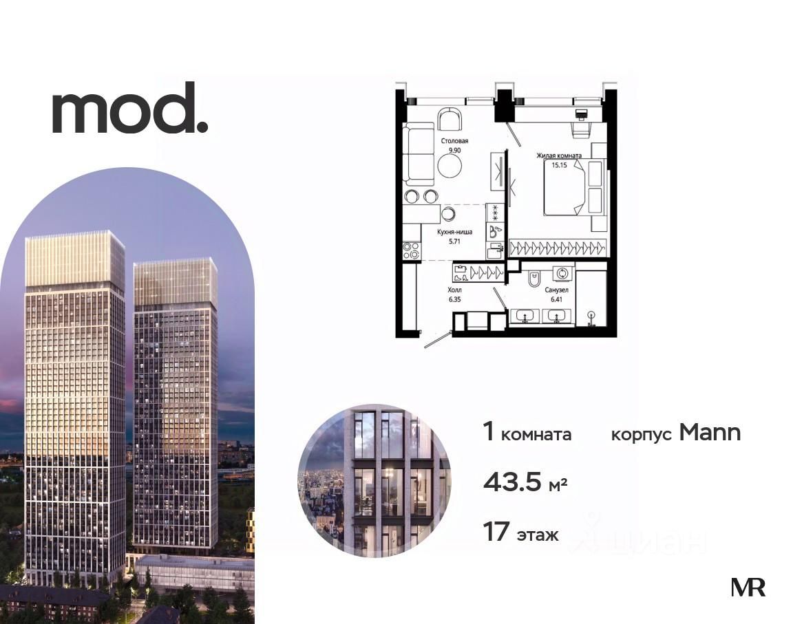 Продается 1-комнатная квартира общей площадью 43.52 м² с предчистовой отделкой в ЖК премиум-класса Mod на 17-м этаже 55 этажного дома.