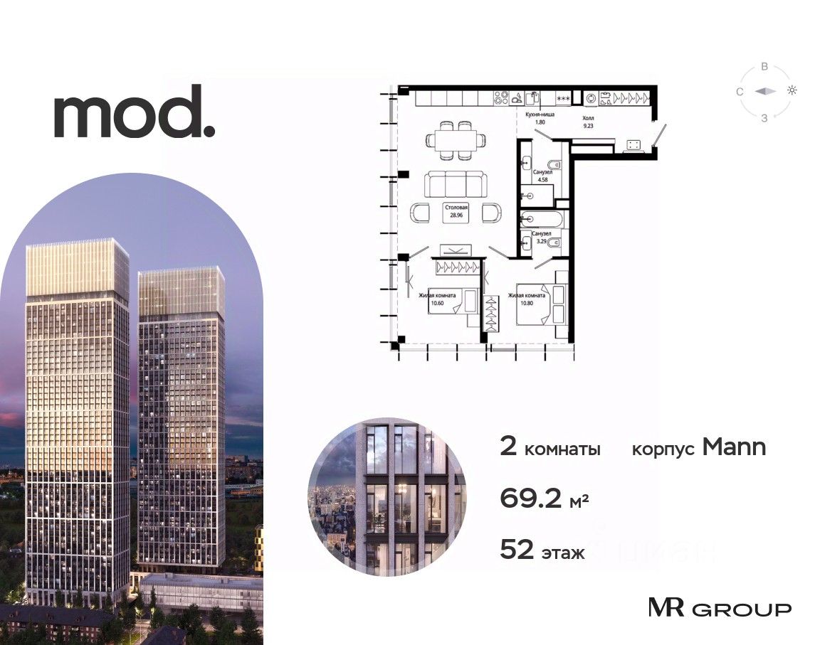 Продается 2-к квартира общей площадью 69.26 м² без отделки в ЖК премиум-класса Mod на 52-м этаже 55 этажного дома.