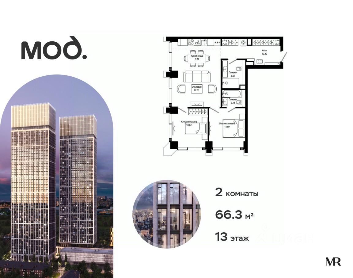 Продается 2-комнатная квартира общей площадью 66.30 м² с предчистовой отделкой в ЖК премиум-класса Мод на 13-м этаже 55 этажного дома.