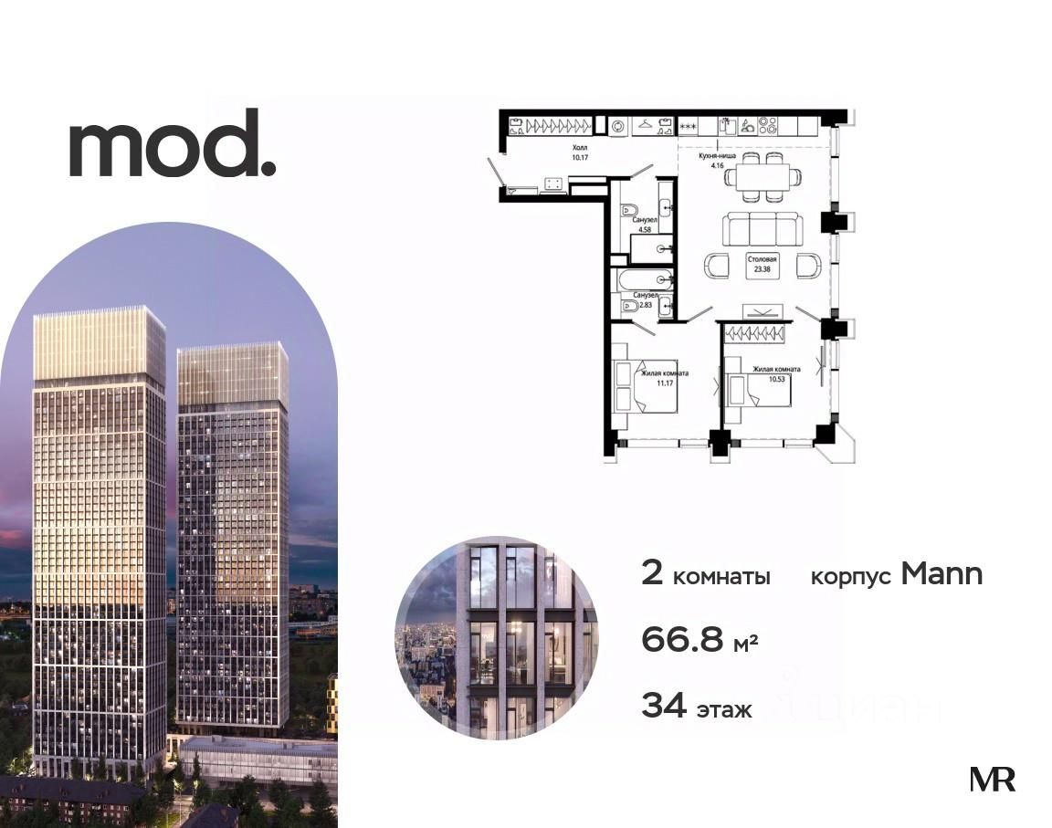 Продается 2-комнатная квартира общей площадью 66.82 м² с предчистовой отделкой в ЖК премиум-класса Mod на 34-м этаже 55 этажного дома.