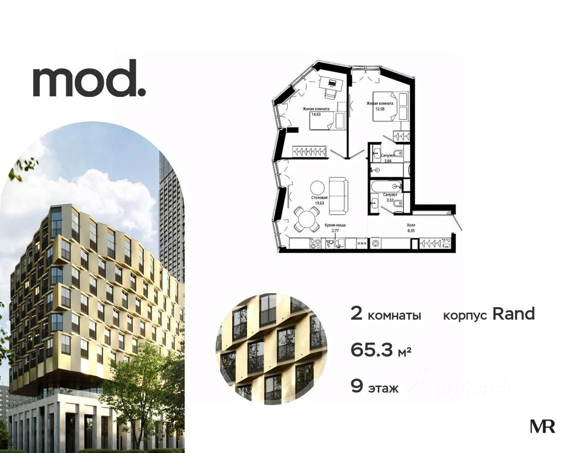 Продается 2-комнатная квартира площадью 65.33 м² с чистовой отделкой в ЖК Mod на 9-м этаже 9 этажного дома.