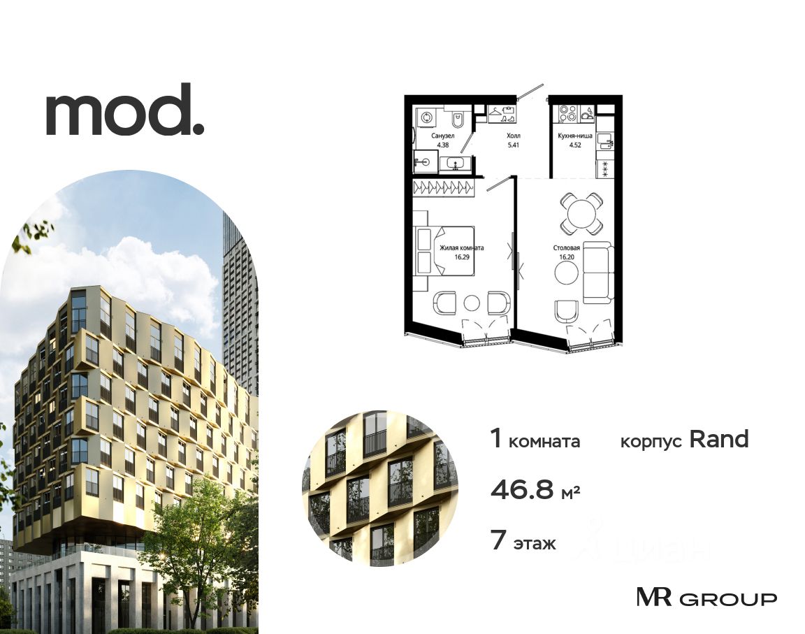 Продается 1-комнатная квартира площадью 46.80 м² с чистовой отделкой в ЖК Mod на 7-м этаже 9 этажного дома.