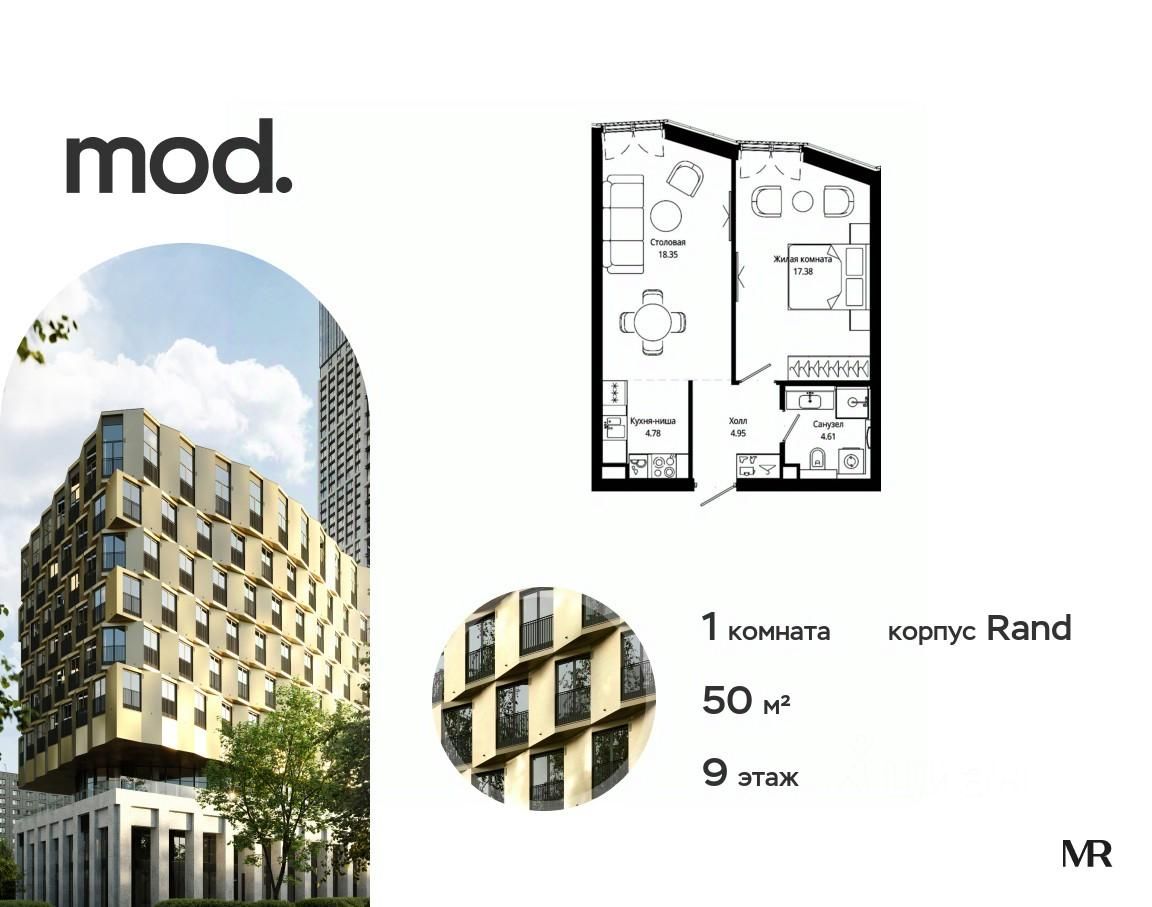 Продается 1-комнатная квартира площадью 50.07 м² с чистовой отделкой в ЖК Mod на 9-м этаже 9 этажного дома.