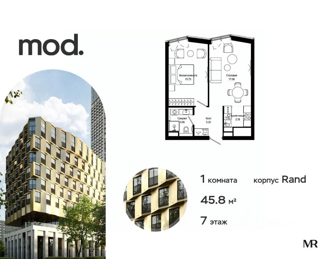 Продается 1-комнатная квартира площадью 45.85 м² с чистовой отделкой в ЖК Mod на 7-м этаже 9 этажного дома.
