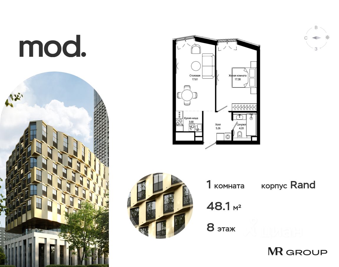 Продается 1-к квартира площадью 48.13 м² с чистовой отделкой в ЖК Mod на 8-м этаже 9 этажного дома.