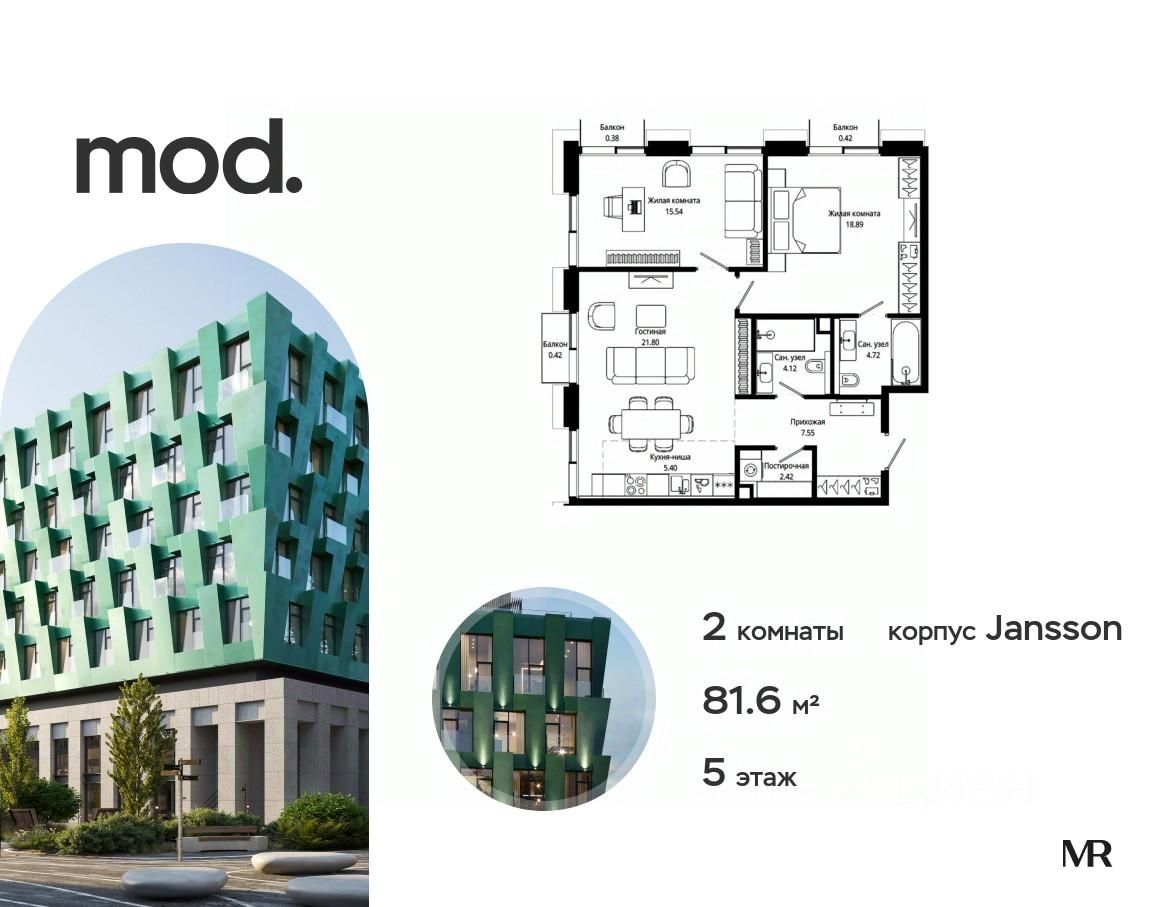 Продается 2-комнатная квартира площадью 81.66 м² с предчистовой отделкой в ЖК Mod на 5-м этаже 7 этажного дома.