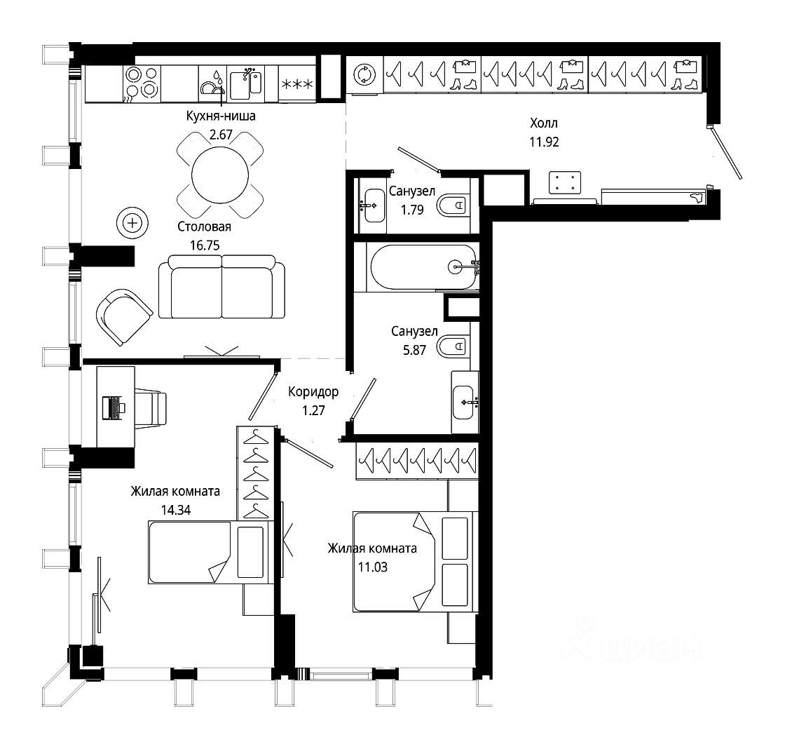 Продается 2-комнатная квартира общей площадью 65.64 м² с предчистовой отделкой в ЖК премиум-класса Mod на 30-м этаже 44 этажного дома.