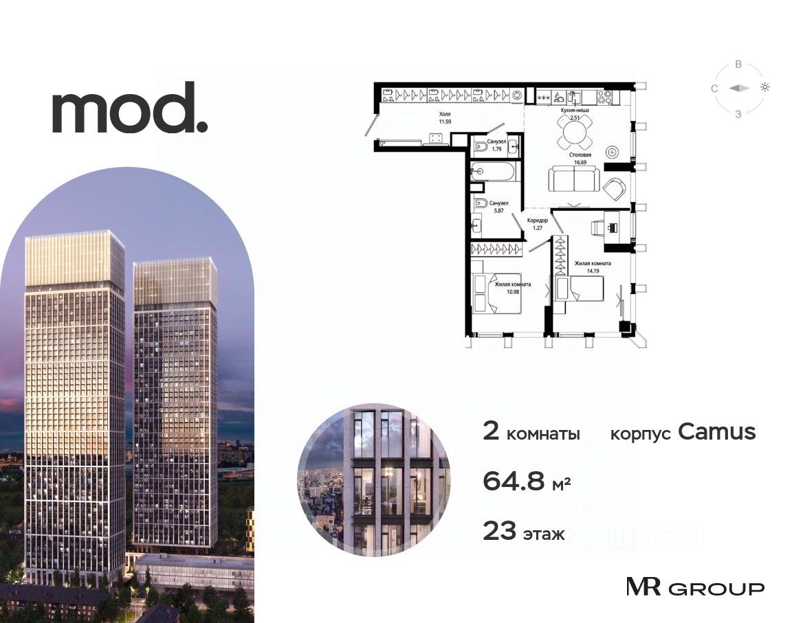 Продается 2-к квартира общей площадью 64.89 м² с предчистовой отделкой в ЖК премиум-класса Mod на 23-м этаже 44 этажного дома.