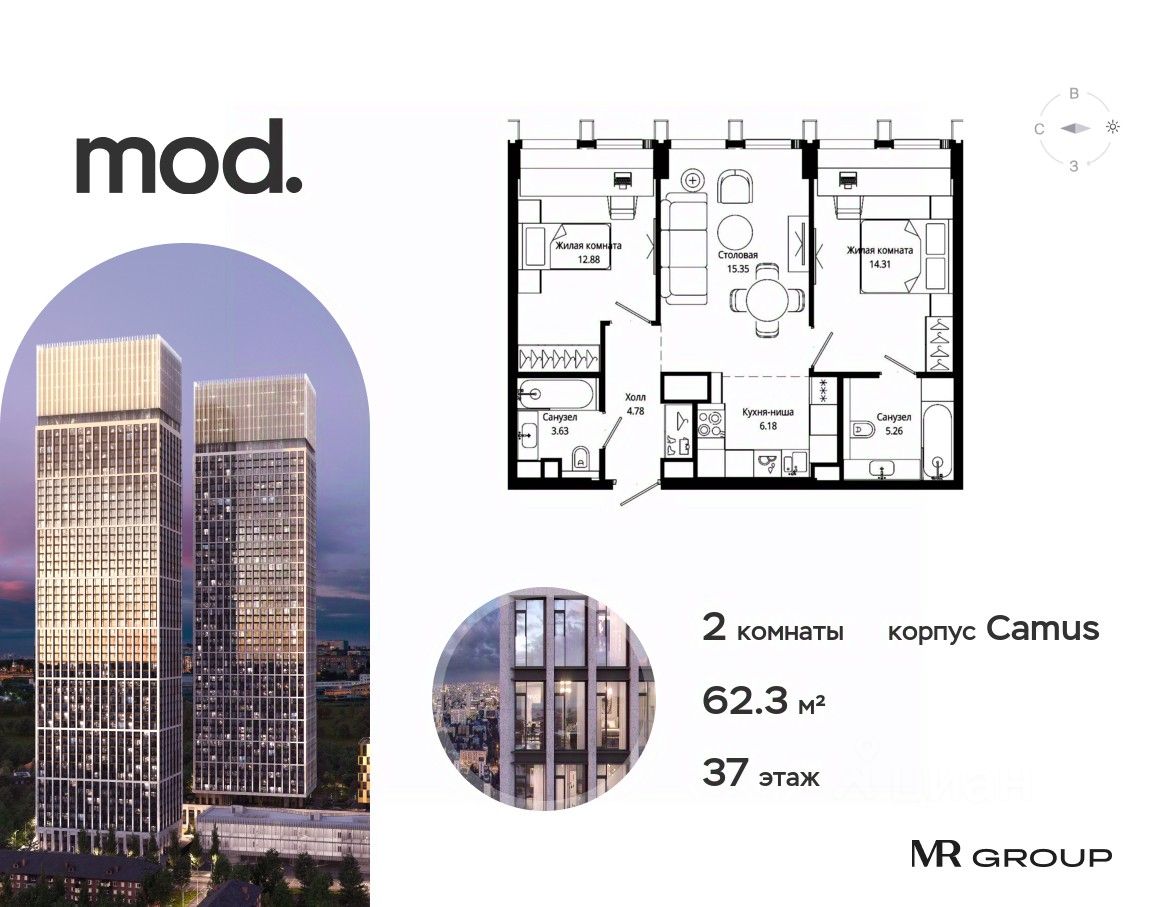 Продается 2-к квартира общей площадью 62.39 м² с предчистовой отделкой в ЖК премиум-класса Mod на 37-м этаже 44 этажного дома.