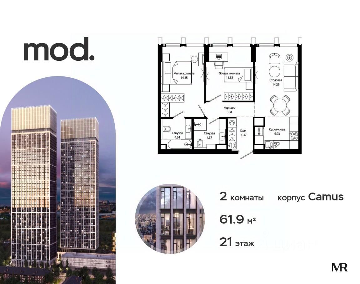 Продается 2-комнатная квартира общей площадью 61.97 м² с предчистовой отделкой в ЖК премиум-класса Mod на 21-м этаже 44 этажного дома.