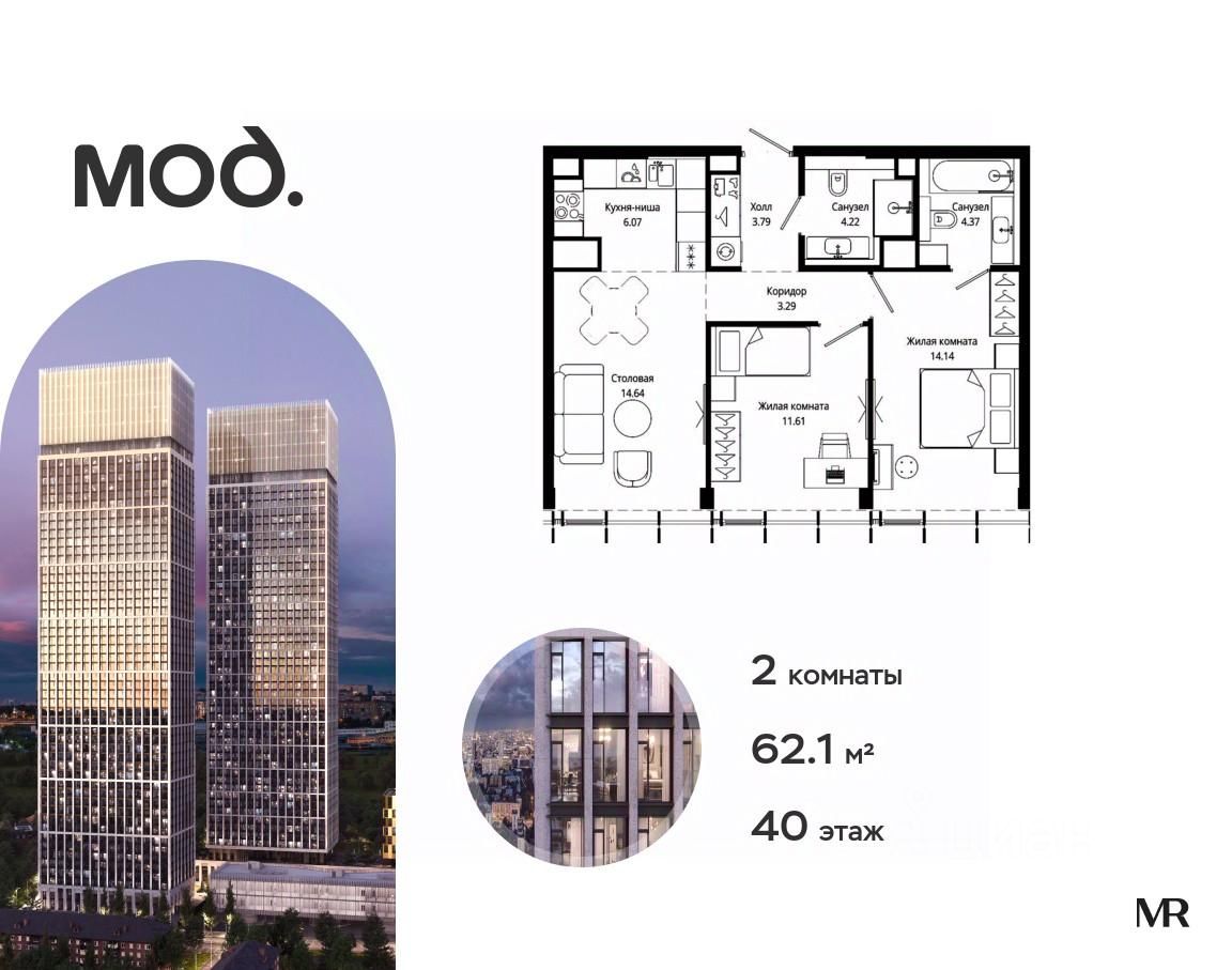Продается 2-комнатная квартира общей площадью 62.10 м² без отделки в ЖК премиум-класса Мод на 40-м этаже 44 этажного дома.
