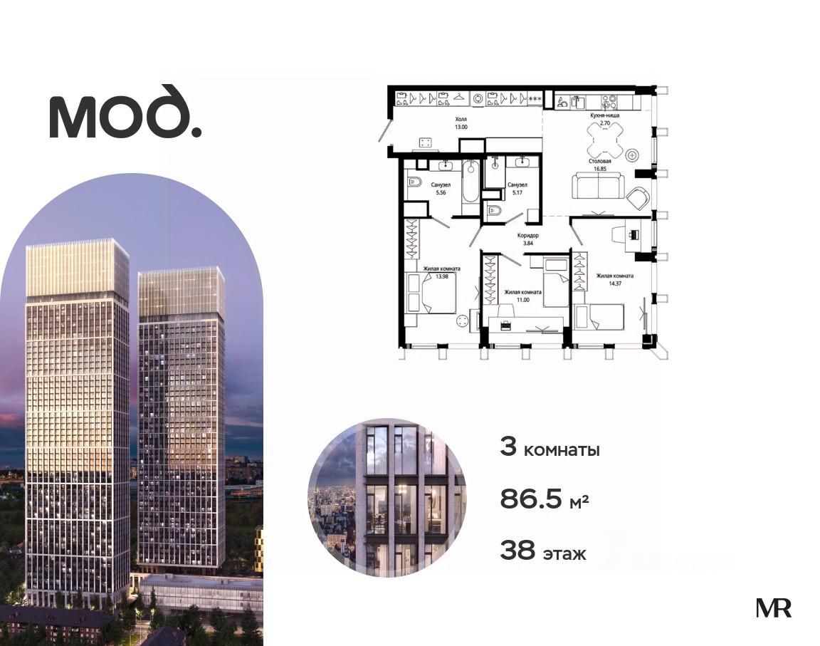 Продается 3-комнатная квартира общей площадью 86.50 м² с предчистовой отделкой в ЖК премиум-класса Мод на 38-м этаже 44 этажного дома.