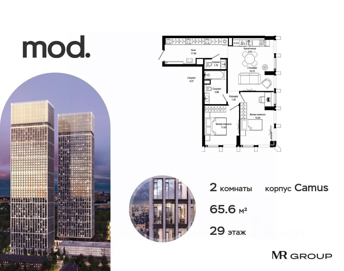 Продается 2-комнатная квартира общей площадью 65.64 м² с предчистовой отделкой в ЖК премиум-класса Mod на 29-м этаже 44 этажного дома.