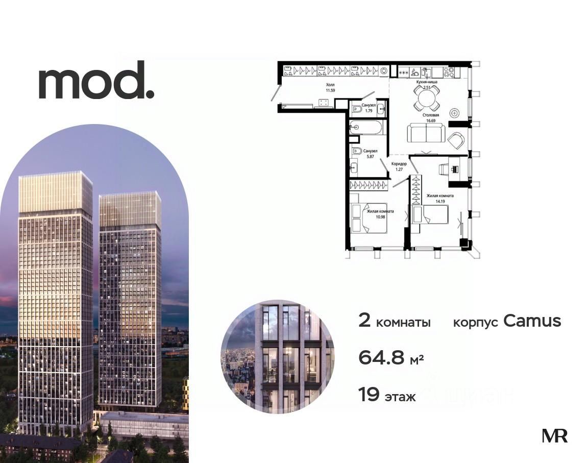 Продается 2-комнатная квартира общей площадью 62.20 м² с предчистовой отделкой в ЖК премиум-класса Mod на 19-м этаже 44 этажного дома.