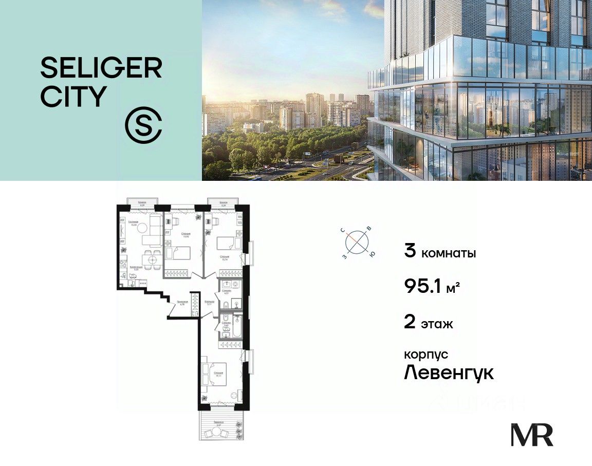 Продаётся 3-комнатная квартира общей площадью 95.12 м² без отделки в ЖК "Селигер Сити" на 2-м этаже 21 этажного дома.