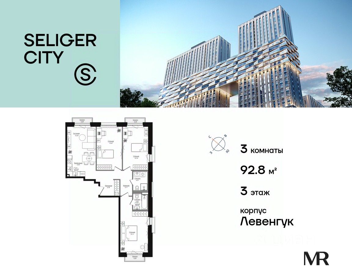 Продаётся 3-комнатная квартира общей площадью 92.82 м² без отделки в ЖК "Селигер Сити" на 3-м этаже 21 этажного дома.