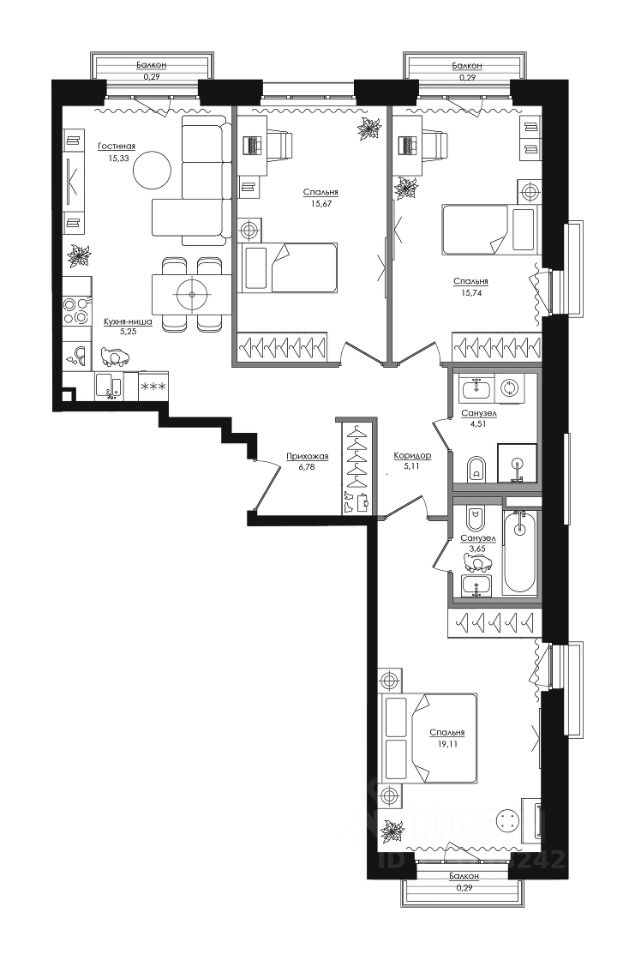- Широкий выбор квартир - от компактных студий до просторных квартир с тремя спальнями и пентхаусов