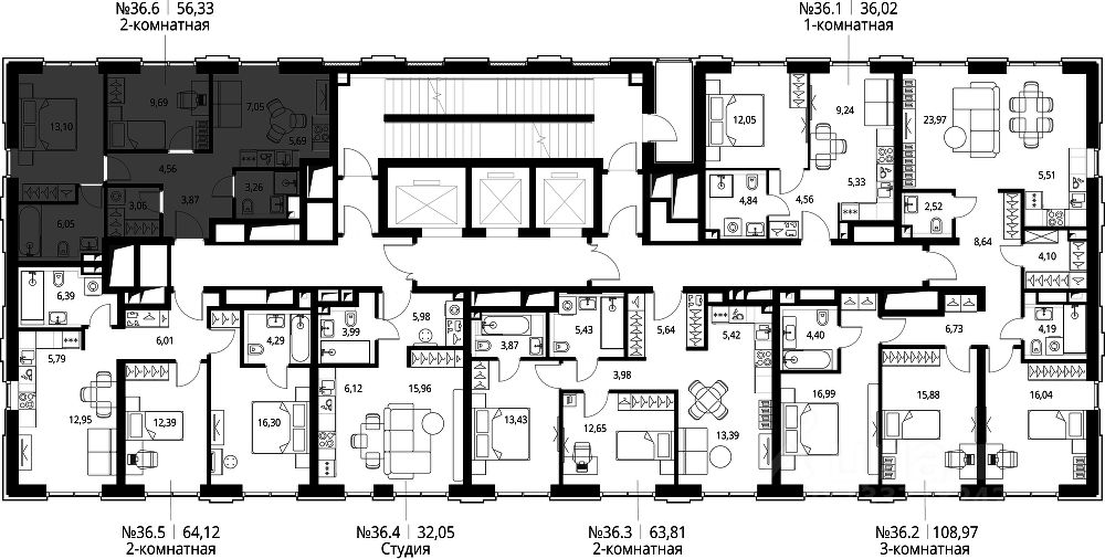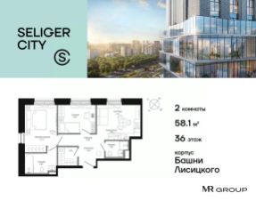 Продаётся 2-к квартира общей площадью 58.19 м² без отделки в ЖК "Селигер Сити" на 36-м этаже башни Лисицкого.