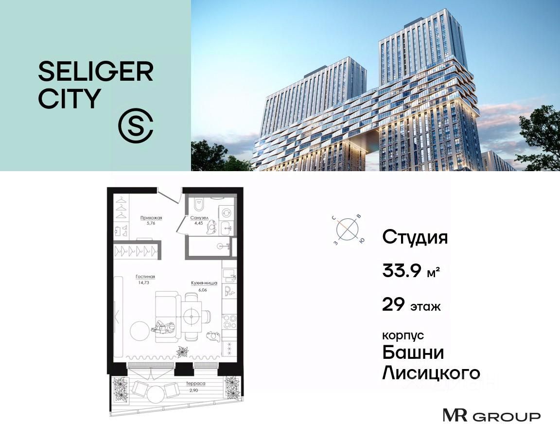 Продаётся студия общей площадью 34.45 м² с предчистовой отделкой в ЖК "Селигер Сити" на 29-м этаже башни Лисицкого.