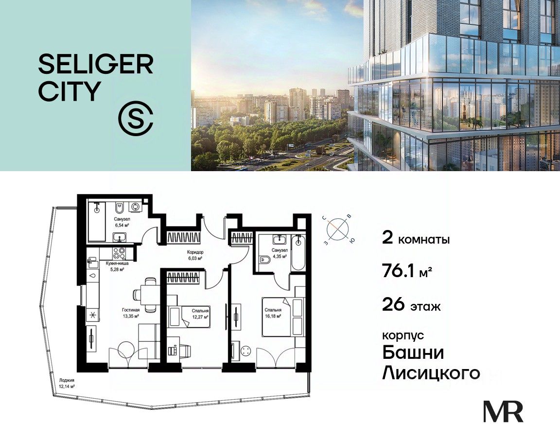 Продаётся 2-комнатная квартира общей площадью 76.14 м² с предчистовой отделкой в ЖК "Селигер Сити" на 26-м этаже башни Лисицкого.