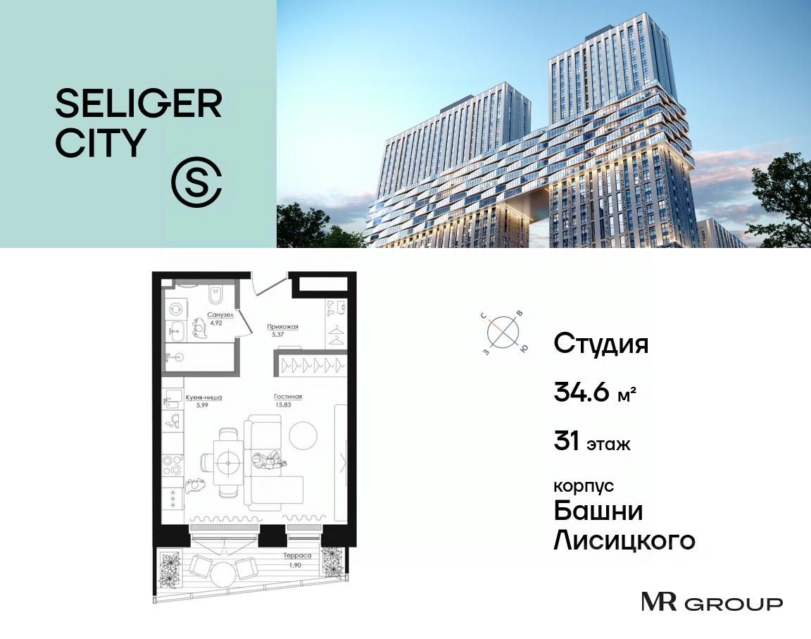 Продаётся студия общей площадью 34.69 м² без отделки в ЖК "Селигер Сити" на 31-м этаже башни Лисицкого.