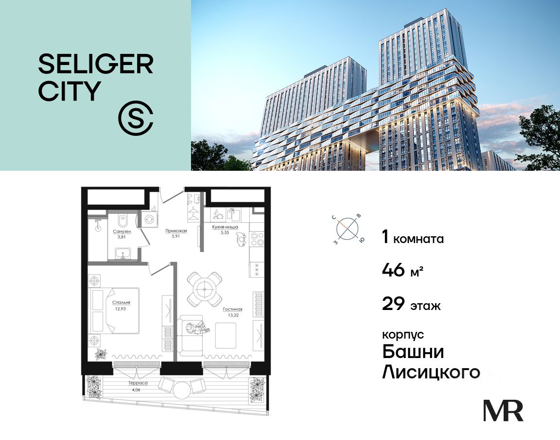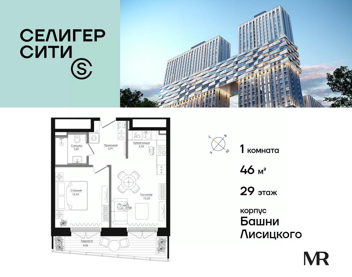 Продаётся 1-комнатная квартира общей площадью 46.07 м² с предчистовой отделкой в ЖК "Селигер Сити" на 29-м этаже башни Лисицкого.