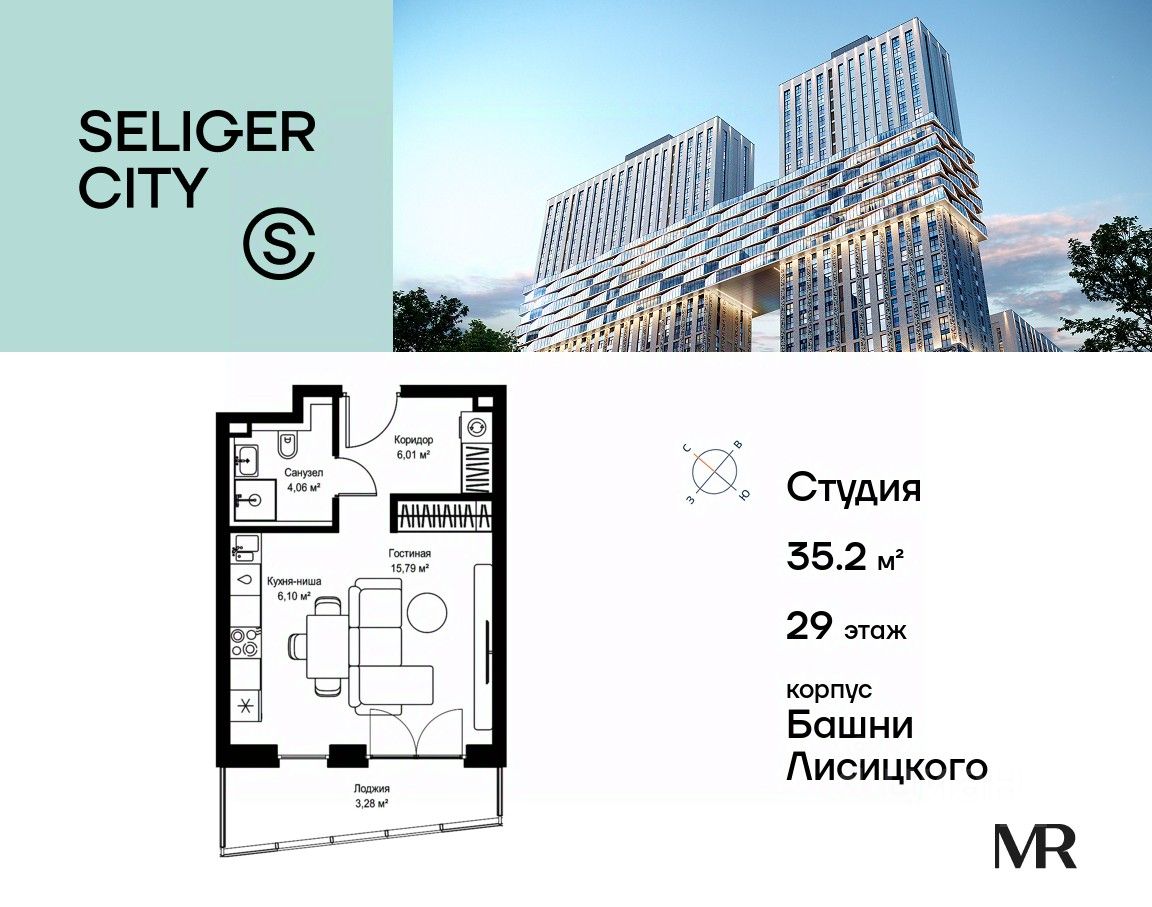 Продаётся студия общей площадью 35.24 м² с предчистовой отделкой в ЖК "Селигер Сити" на 29-м этаже башни Лисицкого.