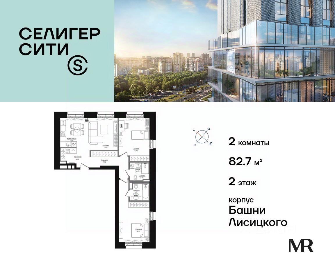 Продаётся 2-комнатная квартира общей площадью 82.77 м² с предчистовой отделкой в ЖК "Селигер Сити" на 2-м этаже башни Лисицкого.