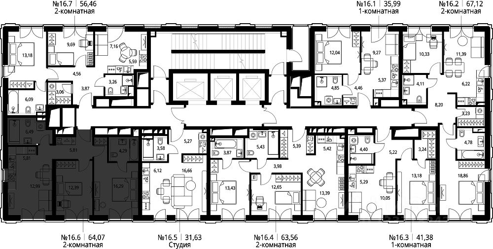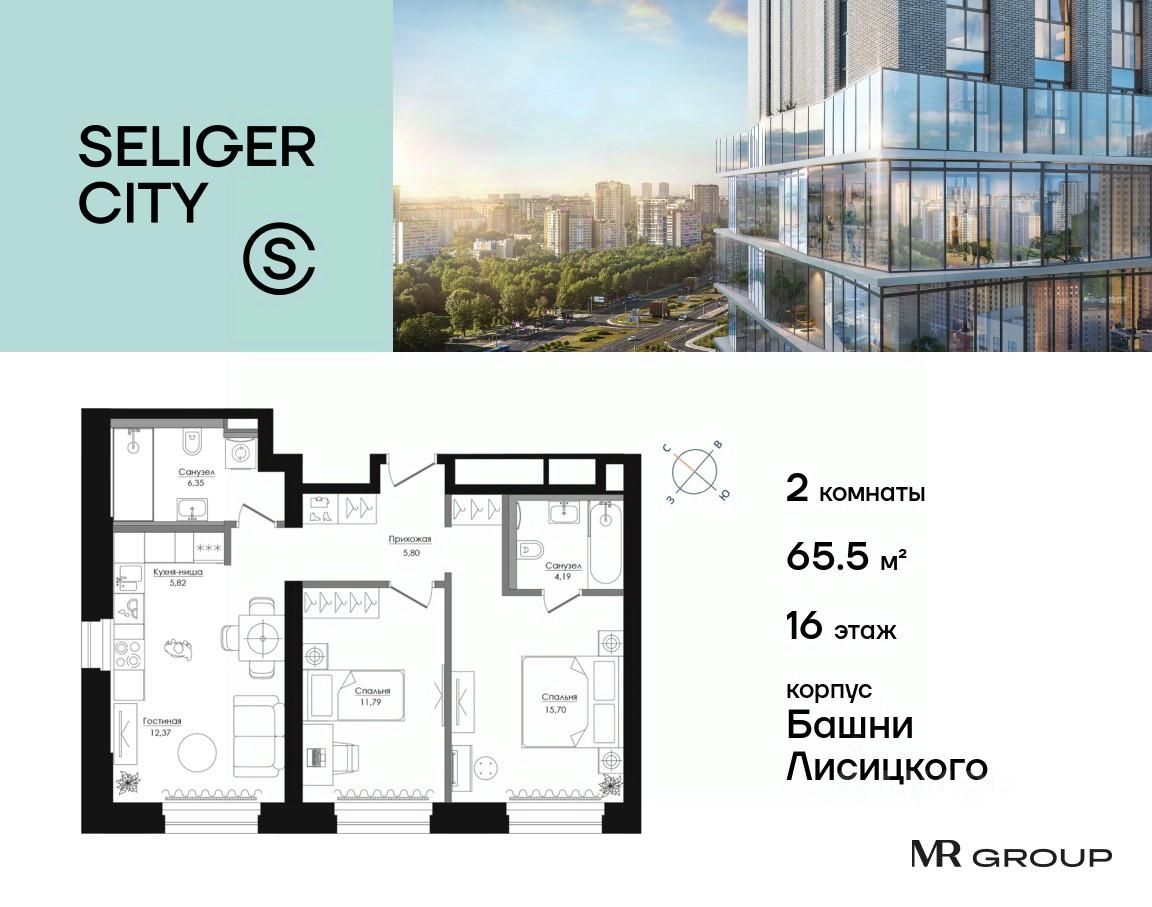 Продаётся 2-комнатная квартира общей площадью 65.53 м² без отделки в ЖК "Селигер Сити" на 16-м этаже башни Лисицкого.