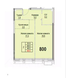 Планировка: Кухня - гостиная 17,3м; Спальня - 16,6м; Ниша под кухню 3,5м; Просторный коридор - 5м; 2 санузла - 4,2м и 1,9.