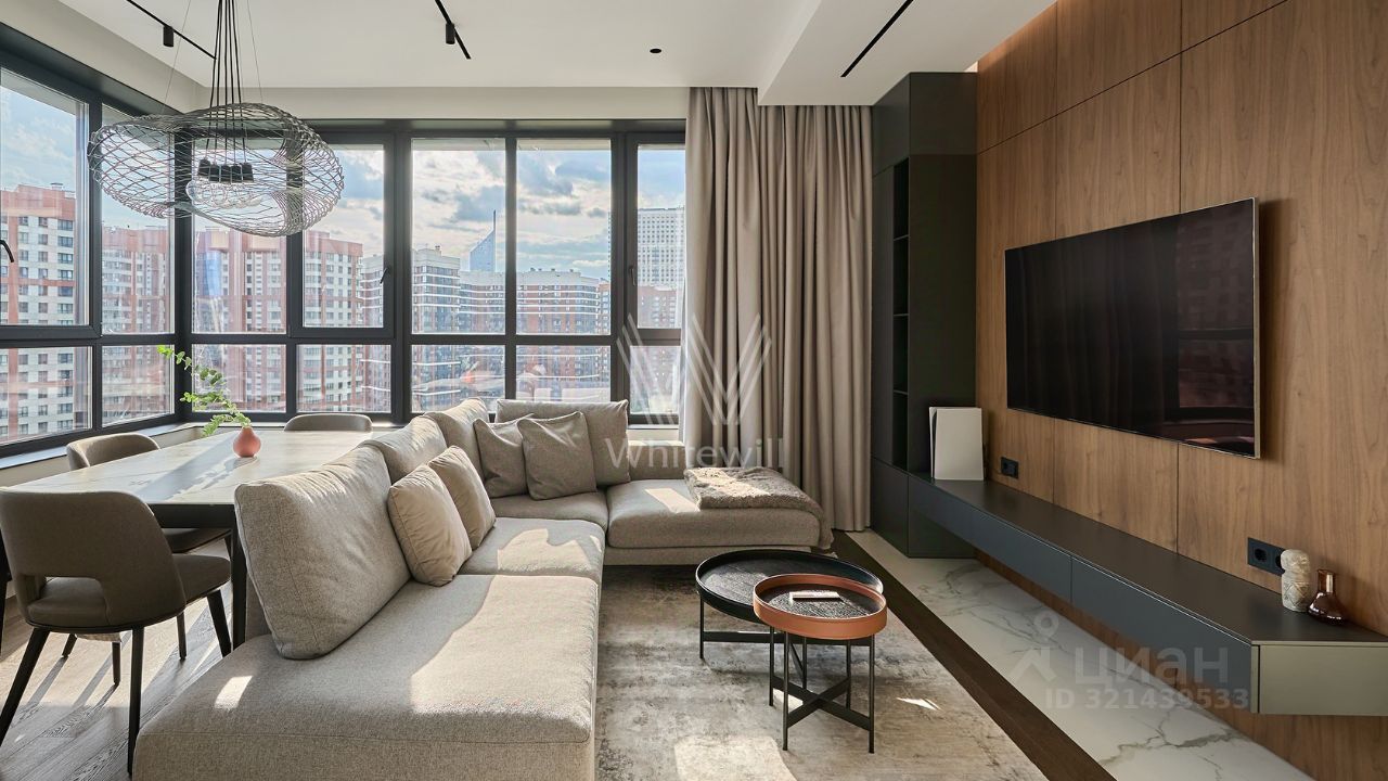 Функциональная планировка включает кухню-гостиную, 2 спальни, ванную комнату с постирочной зоной, гостевой санузел и холл. Благодаря угловому остеклению пространство наполнено естественным светом и теплом, открываются виды на Москву-реку и башни "Москва-Сити".