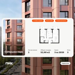 Продаётся 2-комн. квартира площадью 52,9 кв.м на 3 этаже 14 этажного дома (Корпус 69.7, Секция 7) проекта ПИК Саларьево парк. Светлый просторный подъезд на уровне земли, функциональная планировка, большие окна, c отделкой.