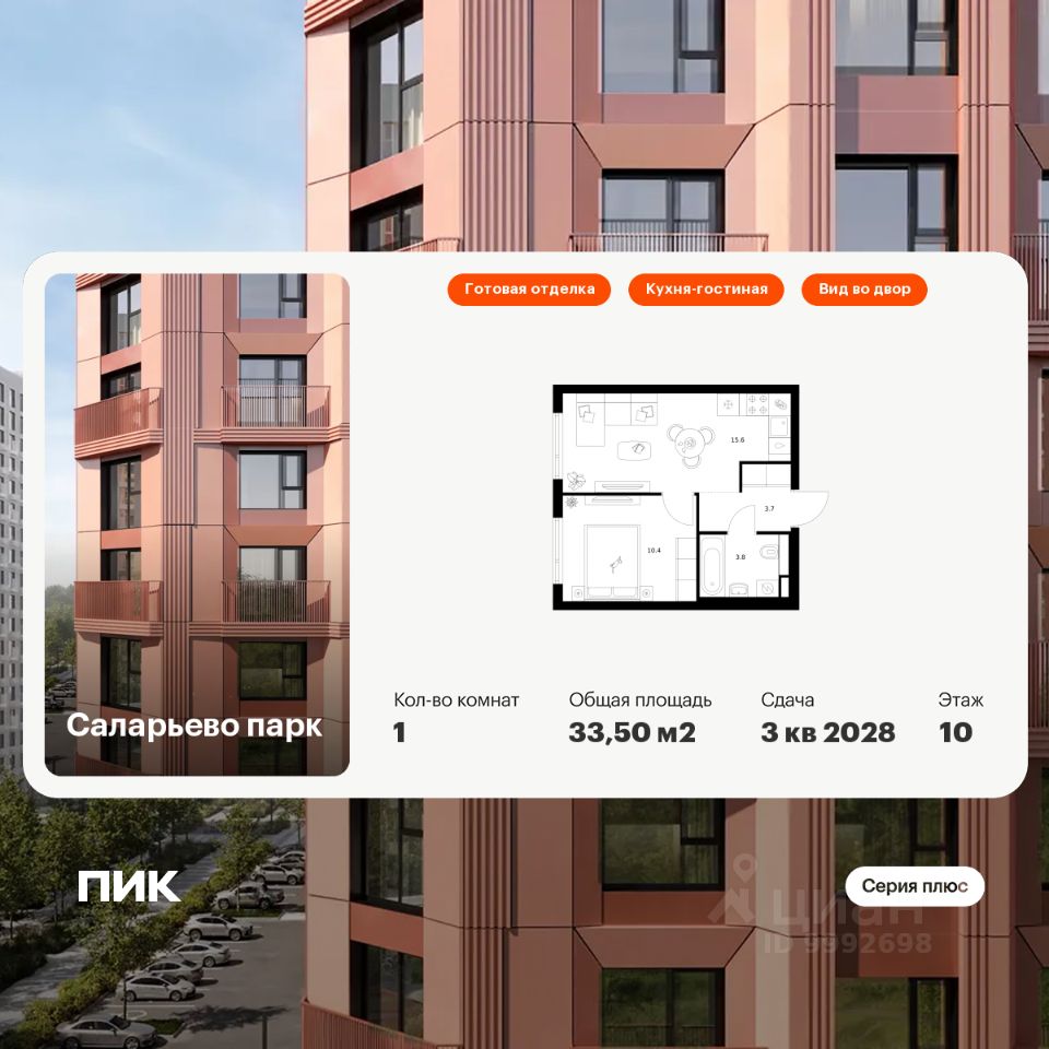 Продаётся 1-комн. квартира площадью 33,5 кв.м на 10 этаже 14 этажного дома (Корпус 69.7, Секция 7) проекта ПИК Саларьево парк. Светлый просторный подъезд на уровне земли, функциональная планировка, большие окна, c отделкой.