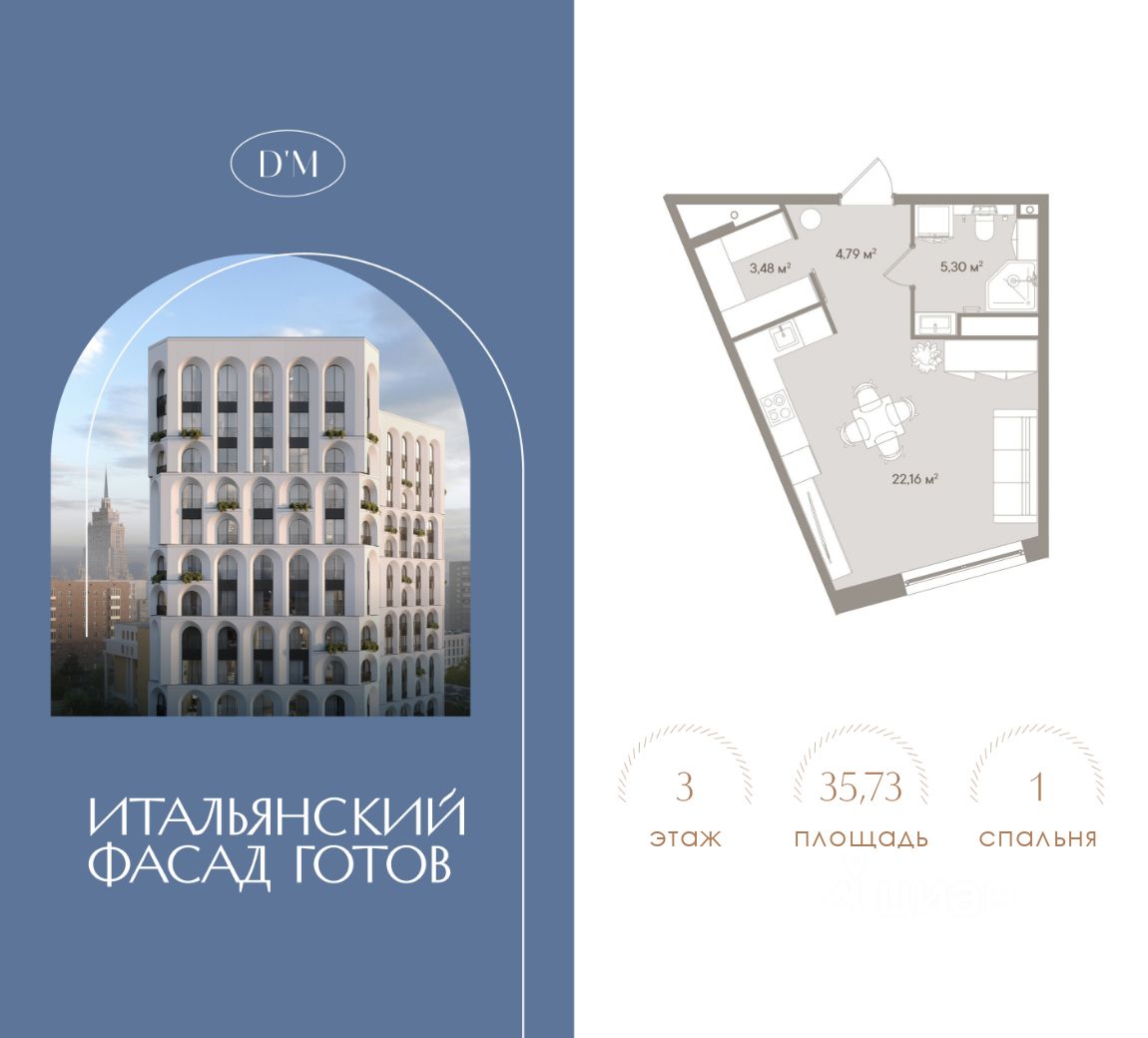 Продаются 1-комнатные апартаменты в строящемся доме (Корпус 1), срок сдачи: II-кв. 2026, общей площадью 35.73 кв.м., на 4 этаже. D`ORO MILLE - клубный апарт-комплекс премиум-класса в Дорогомилово. Его архитектура отсылает к величественным образцам древнеримского зодчества и в то же время, благодаря необыкновенной легкости, утонченности рисунка фасадов, устремлена в будущее. Весь его облик, все 14 этажей - это череда стройных воздушных арок, создающих ритмическую гармонию. И, если архитектура - это искусство, то клубный дом D`ORO MILLE, безусловно, произведение этого искусства, арт-объект. Причем не только снаружи: такую же высокую эстетическую планку держат внутри здания изысканные интерьеры общественных пространств, а на приватной территории комплекса - эффектный двор-сад.