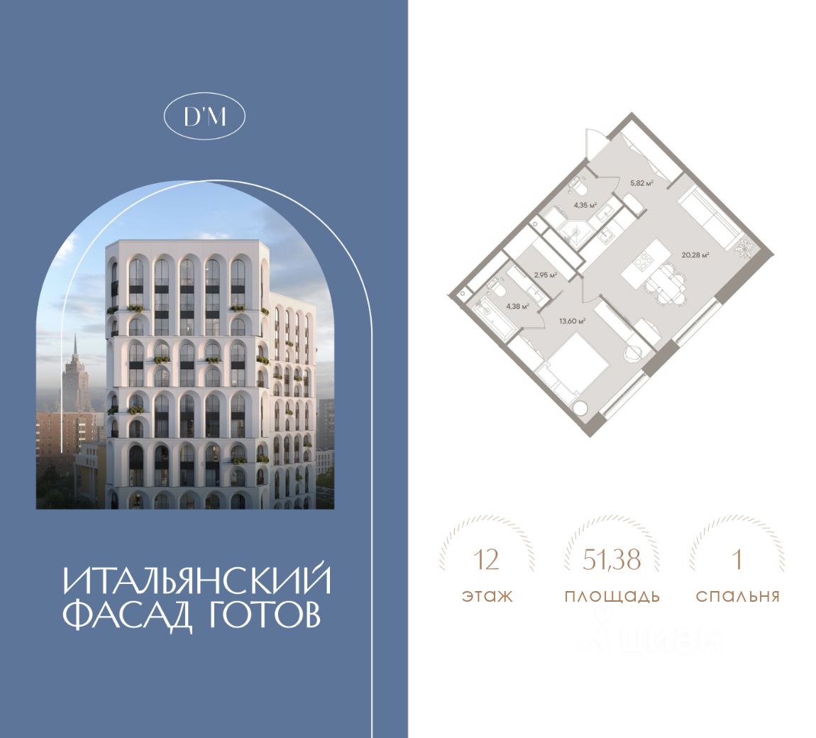Продаются 2-комнатные апартаменты в строящемся доме (Корпус 1), срок сдачи: II-кв. 2026, общей площадью 51.38 кв.м., на 4 этаже. D`ORO MILLE - клубный апарт-комплекс премиум-класса в Дорогомилово. Его архитектура отсылает к величественным образцам древнеримского зодчества и в то же время, благодаря необыкновенной легкости, утонченности рисунка фасадов, устремлена в будущее. Весь его облик, все 14 этажей - это череда стройных воздушных арок, создающих ритмическую гармонию. И, если архитектура - это искусство, то клубный дом D`ORO MILLE, безусловно, произведение этого искусства, арт-объект. Причем не только снаружи: такую же высокую эстетическую планку держат внутри здания изысканные интерьеры общественных пространств, а на приватной территории комплекса - эффектный двор-сад. Клубный дом D`ORO MILLE - это искусство жить: роскошно, гармонично, идеально. Все здесь служит идее создания нового формата жилья - комфортного, функционального, безупречного. Клубный дом D`ORO MILLE находится в районе Дорогомилово. Это престижный исторический район Москвы, который обладает высокоразвитой инфраструктурой: здесь есть все необходимое для жизни, работы, отдыха. Всего в 400 м от клубного дома D`ORO MILLE проходит Кутузовский проспект - одна из главных магистралей столицы и имиджевый торговый коридор, где представлены бутики популярных брендов, рестораны, кафе, отделения банков, салоны красоты и т. д. В радиусе 300 м находятся Дорогомиловский рынок и крупные торгово-развлекательные комплексы "Европейский", "Киевский". Дорогомилово входит в Западный округ столицы, но находится практически в ее центре. По Москвереке он соседствует с Арбатом, Хамовниками, Пресненским районом. И, благодаря мостам, за считанные минуты из Дорогомилова можно доехать до Садового и Бульварного кольца, до ММДЦ "МоскваСити" и Кремля, до ЦУМа и ГУМа, до самых известных театров, галерей, музеев.