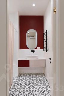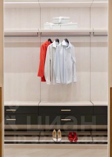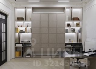 При парадном входе гостей встречает элегантная ниша с зеркалом и огромный встроенный гардеробный шкаф с межкомнатными дверями высотой 2600 мм, выполненными в стиле неоклассика. Слева расположен просторный кабинет для работы, который при необходимости легко превратить в детскую или гостевую комнату.