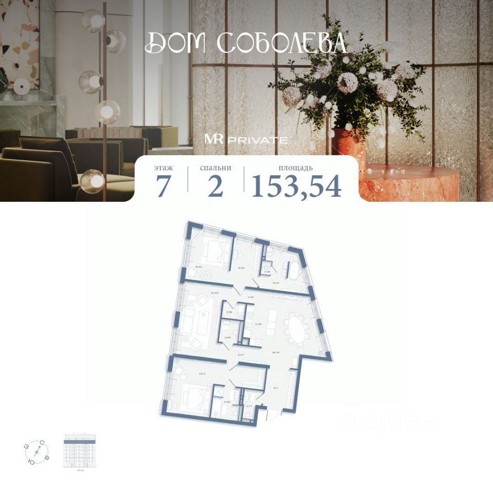 Продаётся 2-к квартира общей площадью 153.54 м² без отделки на 7-м этаже в корпусе 1 проекта Дом Соболева.