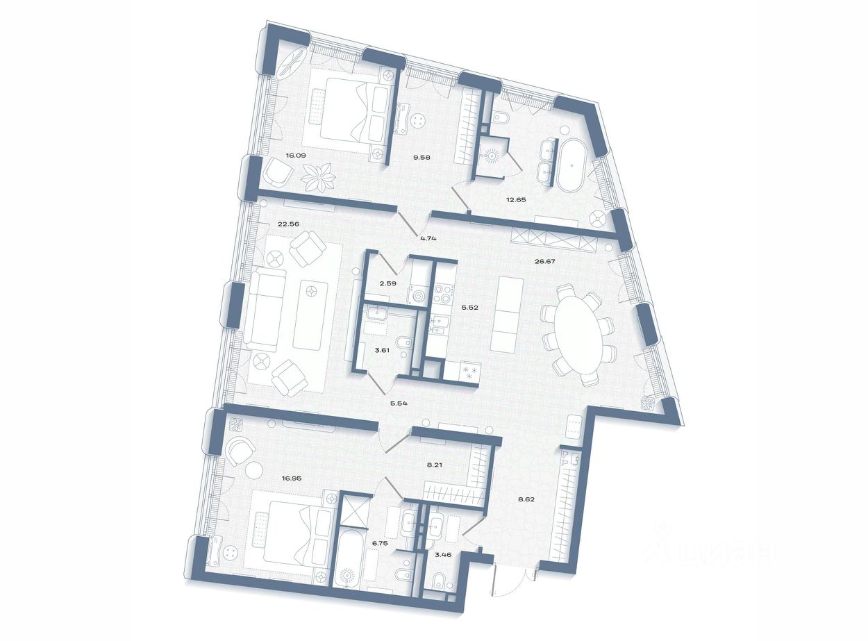 Продаётся 2-комнатная квартира общей площадью 153.54 м² без отделки на 7-м этаже в корпусе 1 проекта Дом Соболева.