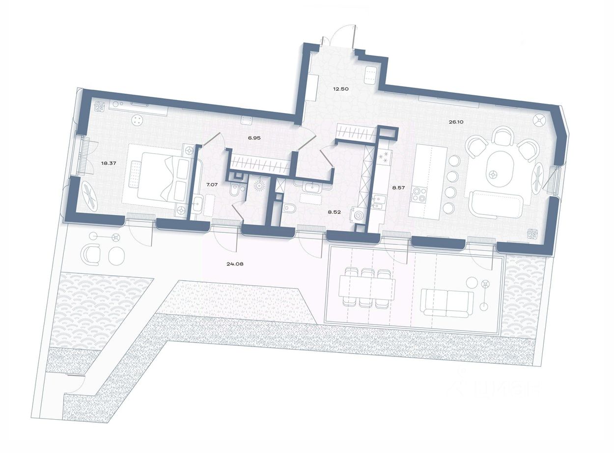 На благоустроенной приватной территории Дома Соболева предусмотрено пространство с несколькими функциональными зонами. Общественная открытая гостиная зона для встречи с друзьями, приватные места для отдыха с книгой и зона для работы на улице с высоким столом.