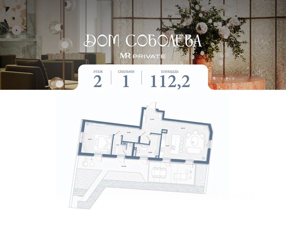 Продаётся 1-комнатная квартира общей площадью 112.16 м² без отделки на 2-м этаже в корпусе 1 проекта Дом Соболева.