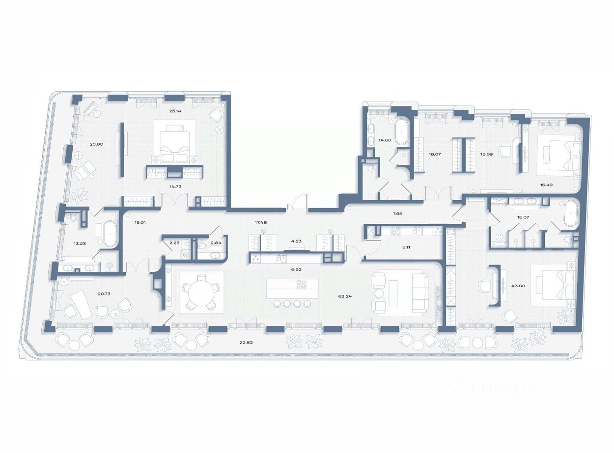 Продаётся 3-комнатная квартира общей площадью 367 м² без отделки на 8-м этаже в корпусе 1 проекта Дом Соболева.