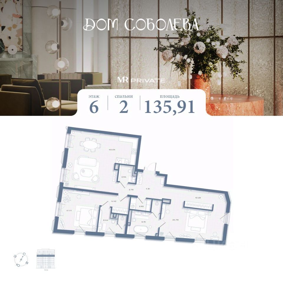 Продаётся 2-к квартира общей площадью 135.91 м² без отделки на 6-м этаже в корпусе 1 проекта Дом Соболева.