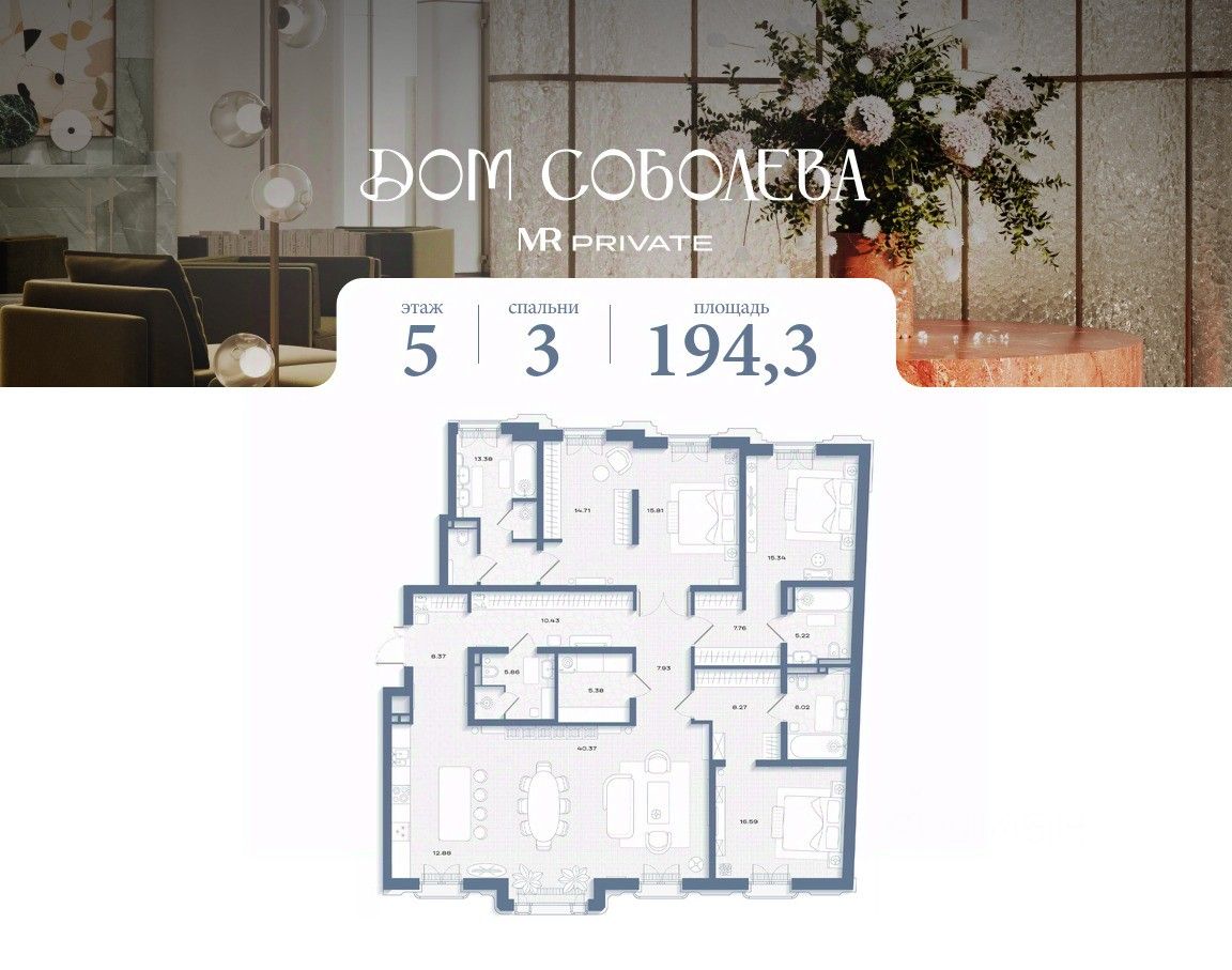 Продаётся 3-комнатная квартира общей площадью 194.32 м² без отделки на 5-м этаже в корпусе 1 проекта Дом Соболева.