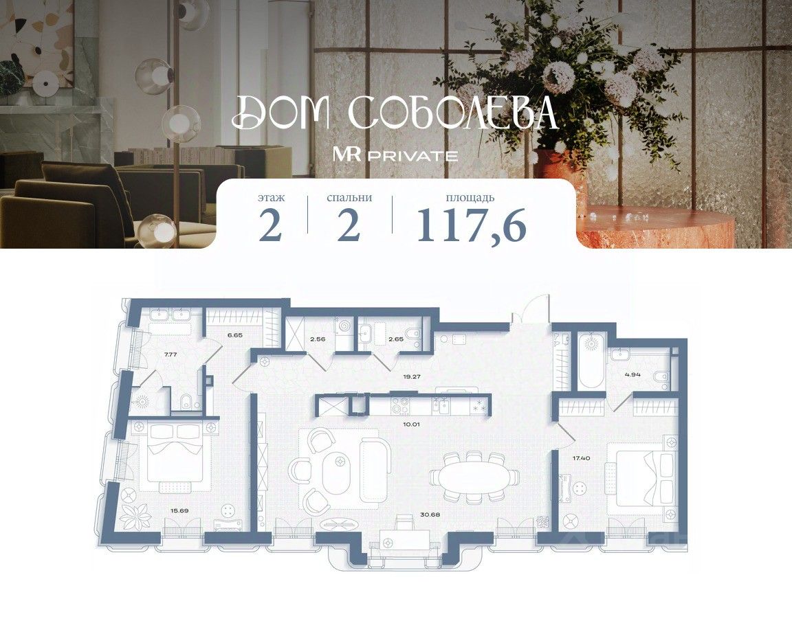Продаётся 2-комнатная квартира общей площадью 117.62 м² без отделки на 2-м этаже в корпусе 1 проекта Дом Соболева.